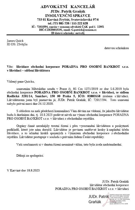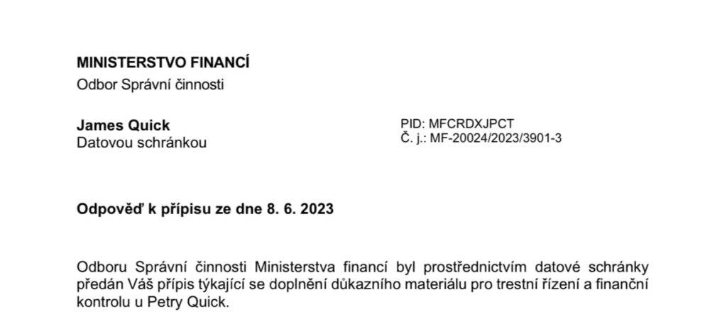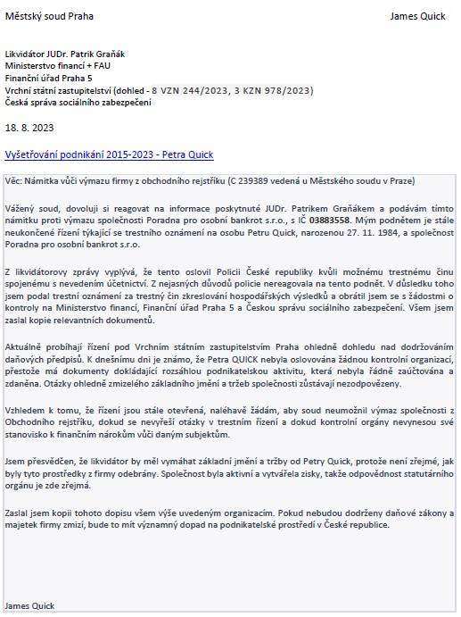 Nelze dovolit, aby Petra Quick těžila z rozporuplných lží ve dvou různých státech. Pokud v Česku Státní zastupitelství nezahájí trestní řízení a Finanční úřad nezasáhne ohledně daní a dalších nároků, vytvoří se tím nebezpečný precedent pro firmy, které jsou likvidovány bez jakékoliv účetní dokumentace, zaplacených daní, aktiva či základního jmění. Tím by byla ohrožena efektivita a vymahatelnost našeho daňového systému.