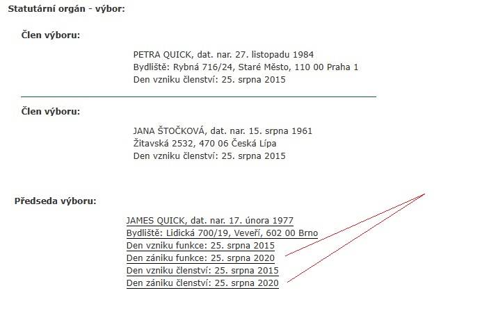 Petra QUICK har varit inaktiv i klubben sedan 2015 tillsammans med sin mor Jana Štočková. För närvarande håller inte klubben någon bokföring och lämnar inte in några skattedeklarationer. Petra bryter mot alla skyldigheter som företagets ledande representant.